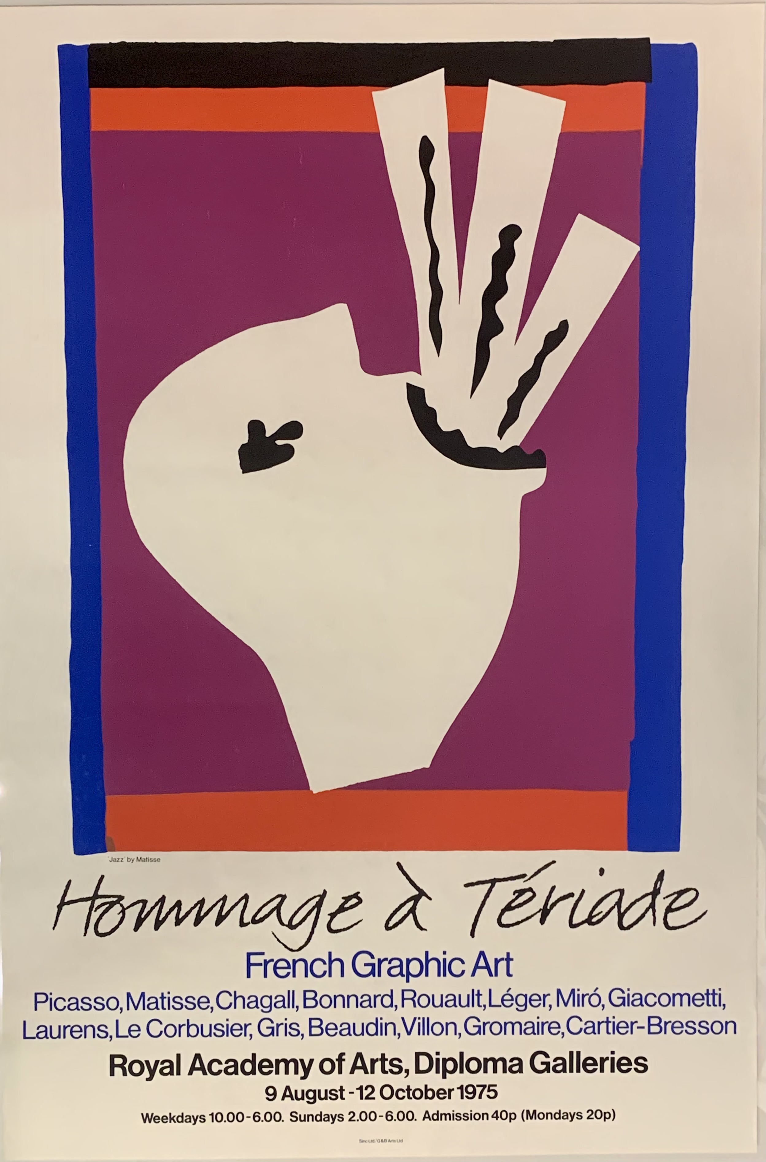 This poster was produced for the 1975 Royal Academy exhibition entitled Hommage a Teriade. The poster feature Matisse’s ‘The Sword Swallower’ (L’Avaleur de sabres) from his 1947 portfolio ‘Jazz’, published by Teriade.