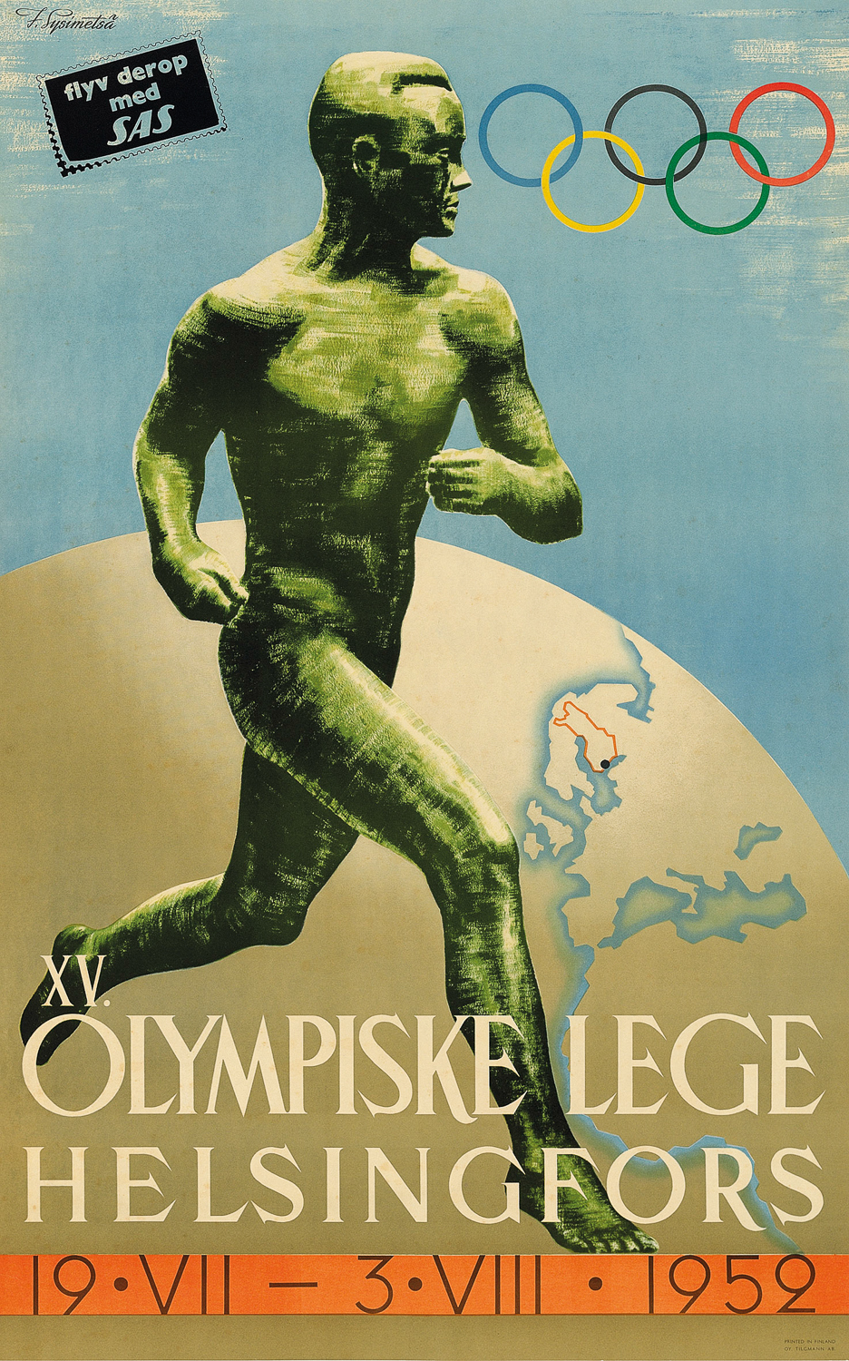 Finnish artist Ilmari Sysimetsa (1912-1955) created this striking, graphic poster for the 1952 Summer Olympics. The Olympics themselves had a troubled history: initially given to Japan in 1940, they were rescheduled to Helsinki before being cancelled altogether due to the outbreak of WWII. It wasn’t until 1952 that the Olympics finally took place in Helsinki.